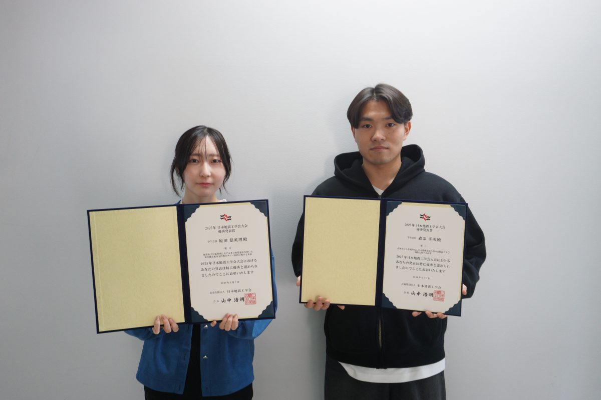 理工学研究科建築・都市学専攻2年の森宗孝明さん(木質構造研究室、指導教員:梶川久光専任教授)と原田慈英理さん(建築構造研究室、指導教員:富澤徹弥専任准教授)が、2025年度日本地震工学会大会(12月9~10日、沖縄県市町村自治会館)において、「優秀発表賞」を受賞しました。